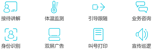 32寸主屏搭載可定制化模塊,提供迎賓接待、業務咨詢、體溫監測等特色服務的智能大屏機器人。可實現接待講解、引導跟隨、宣傳巡邏等功能,還可提供人臉識別、二維碼掃描、身份證讀取、叫號、打印等特色服務。