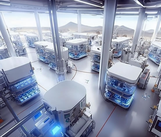 未來云端實驗室可以被建設在太陽能/風能充足的荒漠中,科研人員可以從全世界任意一個地方控制云端實驗室。園區內的兩大主體——數據流和物質流,將分別由互聯的AI網絡和機器人網絡負責運載。(本圖由MidJourney + Adobe Firefly生成)