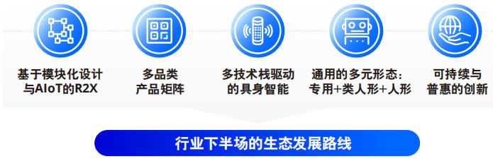 開放性的全棧式智能服務機器人生態的發展 路線是一個多維度、跨領域的綜合性戰略, 進入行業下半場 ,服務機器人正沿著一條創 新的發展道路前進 。這條道路的實現需要依 靠多種戰略的發展 ,其中包括了以模塊化設 計和AIoT技術為基礎 ,構建起R2X (Robot-to- Everything),即機器人與萬物互聯,使得機器 人能夠靈活地與周圍環境和設備進行交互。在 這一生態中 ,專用、類人形和人形機器人三種 形態相輔相成 ,不可替代 ,共同構成了機器人 行業的未來生態 ,以適應各種場景和任務。而 這背后 ,是多技術棧的驅動力 ,它們集成了自 主移動、操作和交互等關鍵技術 ,賦予機器人