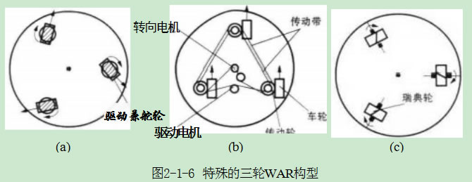 輪配置中也有一些很少見的配置方式,如圖2-1-6所示,圖2-1-6(a) 中 三 個 輪互成120°。車輪不僅可d立驅動而且可以d立轉向;圖2-1-6(b) 三個車輪采用 同步驅動系統控制,三個車輪同時用來驅動與轉向,這種機器人一個突出的特點是機器人本體相對于地面的姿態保持不變;圖2-1-6(c) 互成120°布置的三個車輪采用瑞典輪,通過d立驅動各輪可實現機器人全方位移動。