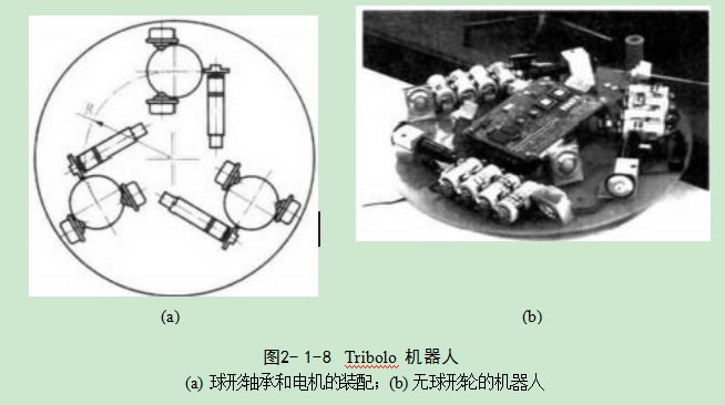 其次,移動機器人底盤的移動方向無直接控制,輪子不對稱的情況會產生各種類型 的誤差。 瑞士聯邦理工大學設計的 Tribolo 是采用3個球形輪的全向驅動的實例,如圖2-1-8(a) 所示,3個球形輪各由一個電機激勵,3個接觸點將球形輪懸掛起來, 其中2個點由球形軸承給定,另一個由連接到電機軸的輪子給定。這種設計的機 器人機動性比較好,而且設計簡單,但是它只適用于平坦的路面和小路,要制造摩擦系數大的圓形輪子是十分困難的。