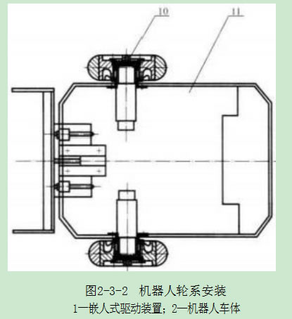 在該裝置中選用帶調速功能的直流電機作為動力,電機轉動時由電機軸直接 帶動,電機驅動法蘭盤與車輪緊固連接,繼而驅動車輪,實現直接驅動,車輪與電機 之間同步旋轉,無任何變速環節和嚙合環節,避免了累計回轉誤差和可能的打滑。 機器人車體上安裝左右兩個驅動裝置,通過對電機轉速的調節來控制車輪轉速和 回轉方向的變化,使機器人實現雙輪差動運動,走直線、圓弧甚至更復雜的運動。 橡膠車輪與電機安裝套間采用一對推力球軸承作為回轉副,軸承與電機安裝套。 外圈與橡膠車輪均為緊配合,兩軸承間以止推環和擋圈保持間距,軸承與電機安裝 套間通過軸承止推法蘭盤和電機安裝套的凸臺限位,保證整體機構的穩定和配合的緊密。整套裝置中,電機安裝套、電機驅動法蘭盤、軸承止推法蘭盤以及相應連 接件推力球軸承、止推環、擋圈全部嵌入橡膠車輪中,配合緊密,同時起到車輪軸的 作用. 由于該結構短而粗,所以剛度強度相當大,能夠承受很強的沖擊。并且選用 的驅動電機嵌入電機安裝套,機器人對抗時車輪承受的沖擊由與車輪緊密配合的 電機安裝套等部件直接承受,避免了電機直接承受沖擊,起到緩沖作用。以上共同 構成雙重嵌入式結構,結構精簡、體積小,穩定性高和緊密度高。嵌入式直接驅動 裝置如圖2-3-1所示,機器人輪系安裝如圖2-3-2所示。