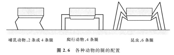 因為腿式機器人的發明是受到生物學上的啟發,所以檢驗一下生物學上成功的 有腿系統是有益的。許多不同的腿的構造已經在各種各樣的生物體中成功地存在 (圖2.6)。大型動物,如哺乳動物和爬行動物有4條腿,而昆蟲有6條腿或更多。某 些哺乳動物,僅靠2條腿行走的能力已經很出色。尤其是人類,平衡能力已經進展到 甚至可用單腿進行跳躍的水平①。這種異常的機動性是以很高代價得來的:為保持平 衡而使用更復雜的主動控制 。
