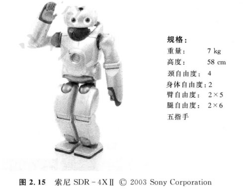 索尼夢想機器人,即SDR-4X Ⅱ模型,如圖2.15所示。這個流行的模型是1997 年開始的研究結果,它以運動表演和交際娛樂(如跳舞和唱歌)為基本目的。這個具 有38個自由度的機器人,為了聲音的精細定向、基于圖像的人員識別、單板微型立體 景深圖的重構以及有限的語音識別,裝有7個麥克風。給定了流媒體和娛樂運動的 目標,索尼公司花費了巨大的精力設計了運動的原型應用系統,它能使他們的工程師 以簡捷的方式編排舞蹈。要注意的是,SDR-4XI 比較小,站立58cm, 重量僅6.5kg。