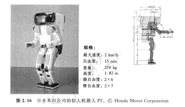 本田公司的擬人機器人項目有著值得注意的發展經歷。但是此外,它還抓住了 激勵的非常重要的工程挑戰。圖2.16展示了模型 P2, 它是Z新模型 Asimo (在發明 移動性中有超前步伐)Z直接的先驅。注意,Z新的本田 Asimo 模型仍然比 SDR- 4X I大得多,高120 cm, 重52 kg 。這可在保持不危險尺寸和姿勢的同時,能在有樓 梯和臺階的人類環境中具有實用的機動性。也許這是展示仿生的雙腳上下樓梯的第 一個機器人。這些本田擬人系列的機器人不是專門為娛樂目的而設計,而是作為整 個社會的人類幫手而設計。例如,本田公司把Asimo 的高度當作機器人能對人類環 境進行管理操作(如控制燈開關)的Z小高度。