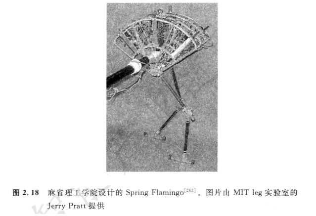 雙腳機器人只能在某些限制內靜態地穩定。因此,像P2 和WABIAN-2R 這樣的 機器人即使站著不動,通常也需要連續地進行伺服平衡校正。而且,各條腿都需要有足 夠的容量以支撐機器人全部重量。在四腿機器人情況下,平衡問題隨各條腿上的負荷 需求而變得容易解決。雙腿機器人的 一個 出色設計是麻省理工學院設計的Spring Fla- mingo (圖2. 18)。這個機器人與腿激勵器相連,插入了彈簧,實現更有彈性的步態。通過與限制膝蓋關節角度的“膝蓋骨”相結合,Flamingo 實現了驚人的仿生運動。