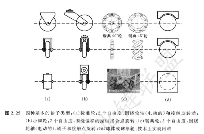 有四種主要的輪子類型,如圖2.25所示。在運動學方面,它們差別很大。因此 輪子類型的選擇對移動機器人的整個運動學有很大的影響。標準輪和小腳輪有一個 旋轉主軸,因而是高度有向的。在不同的方向運動,需要先沿著垂直軸操縱輪子。 這兩種輪的主要差別在于標準輪可以完成操縱而無副作用,因為旋轉中心經過接觸 片著地;而小腳輪繞偏心軸旋轉,在操縱期間會引起一個力,加到機器人的底盤。