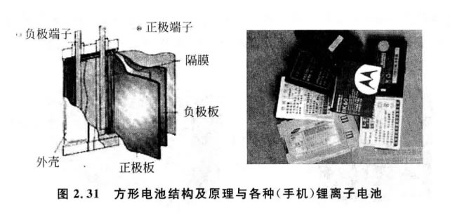 鋰電池是指電化學體系中含有鋰(包括金屬鋰、鋰合金、鋰離子、鋰聚合物),由鋰金 屬或鋰合金為負極材料、使用非水電解質溶液的電池。鋰電池大致分為鋰金屬電池和鋰 離子電池兩類。鋰金屬電池內含金屬態鋰,它通常是不可充電的。鋰離子電池不含有金 屬態鋰,它可以充電。Z早出現的鋰電池來自于偉大的發明家愛迪生,他使用了反應 Li+MnO₂=LiMnO₂ 。 該反應為氧化還原反應和放電。由于鋰金屬的化學特性非常活 潑,使得鋰金屬的加工和保存及使用對環境要求非常高,所以鋰電池長期沒有得到廣泛 應用。但是,鋰電池現在已經成為了主流,如圖2.31所示。鋰離子電池中因為不含有重 金屬鎘,與鎳鎘電池相比較,它可以大大減少對環境的污染。