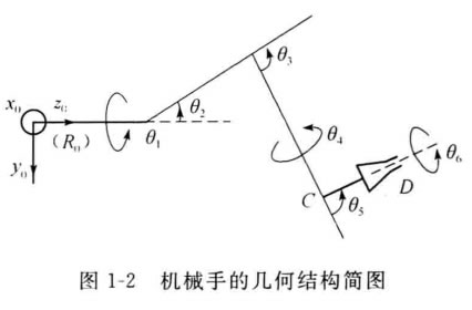 機械手是具有傳動執行裝置的機械,它由臂、關節和末端執行裝置(工具等)構成,組合為一個互相連接和互相依賴的運動機構。機 械手用于執行指定的作業任務。不同的機械手 具有不同的結構類型。圖1-2給出機械手的幾何 結構簡圖。機械手又稱為操作機、機械臂或操 作手。大多數機械手是具有幾個自由度的關節 式機械結構, 一般具有六個自由度。其中,頭 三個自由度引導夾手裝置至所需位置,而后三 個自由度用來決定末端執行裝置的方向。