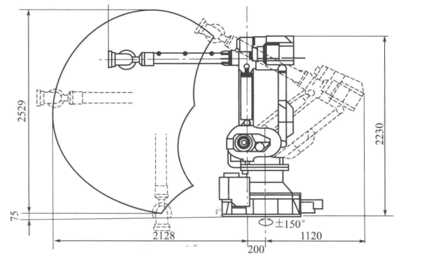 以持重100kg, Z高速度4m/s 的六軸垂直多關節機器人為例,其規格性能如圖6-1及 表6-2所示,這是一種典型的點焊機器人,可勝任大多數車體裝配工序的點焊作業。由于使 用中幾乎全部用來完成間隔為30~50mm 的打點焊接作業,運動中很少能達到Z高速度, 因此,改善Z短時間內頻繁短節距啟動、制動的性能是本機追求的重點。為了提高加速度和減速度,在設計中注意減輕手臂的重量,增加驅動系統的輸出力矩。