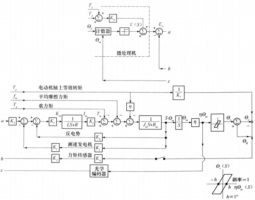 現在市場上供應的工業機器人,其關節數為3~7個。Z典型的工業機器人具有6個關 節,存在6個自由度,帶有夾手(通常稱為手或末端執行裝置)。辛辛那提-米拉克龍 T3 、 尤尼梅遜的PUMA 650 和斯坦福機械手都是具有6個關節的工業機器人,并分別由液壓、 氣壓或電氣傳動裝置驅動。其中,斯坦福機械手具有反饋控制,它的一個關節控制方框圖 如圖5-11所示。從圖可見,它有個光學編碼器,以便與測速發電機一起組成位置和速度反饋。這種工業機器人是一種定位裝置,它的每個關節都有一個位置控制系統。