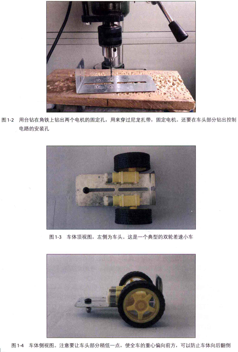 電機和車輪是市場上常見的型號,在網上任何 一 家機器人零件店里都可以找 到,幾乎是國內機器人模型的標配動力部件。角鐵是裝修時留下的,不知道Z初 用在哪里,可能是用來吊裝抽油煙機的標準件。蓋形螺帽是自行車上的配件。 M6 螺絲、螺母是從散料堆里挑出來的,正好可以穿過角鐵上的槽口,在末端固 定蓋形螺帽。