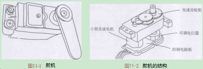 不過在有的時候,單單有直流減速電機也是不夠用的,因為它的運動并不準確,僅靠它我們是無法知道電機運動的準確速度或位置的。而當我們制作機器人的手臂,肯定需要知道手臂的準確運動狀態,否則我們的器人也就沒法準確地完成任務了。因此,這個時 候就需要使用舵機了,如圖11-1所示。它其實就是在直流減速電機的基礎上增加了一個檢測位置的微型傳感器和一個控制器組成的閉環反饋控制系統,從而實現對電機轉動位置的準確控制。舵機的內部結構如圖11-2所示。因為航海模愛好者們經常用這種電機 來控制模型的方向舵,所以它就被俗稱為“舵機”了。下面就來學習如何用舵機制作和控 制機器人手臂的運動。