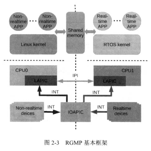 RGMP 是一個利用多核架構實現的實時與非實時操作d立運行的混合操作 系統框架,如圖2-3所示。通用操作系統(Linux) 和實時操作系統(RTOS) 在 各自的 CPU 上d立執行。I/O 設備被分成實時設備和非實時設備,分別被實時 操作系統和非實時操作系統控制。中斷控制器被用作中斷路由器,將兩種設備 的中斷信號路由到相應的操作系統。其中, RTOS 接受實時中斷,如電機驅動、 傳感器等產生的中斷信號;Linux 接受非實時中斷,如人機交互、顯示等中斷信 息。實時操作系統和通用操作系統都完全控制自己的 CPU, 所以沒有多余的軟 件層需要介入到操作系統和硬件之間。硬件中斷被每個操作系統直接處理。同 時各個操作系統d立運行在各自的CPU 上不僅解決了CPU 共享問題,還能確保 操作系統之間不會相互影響。