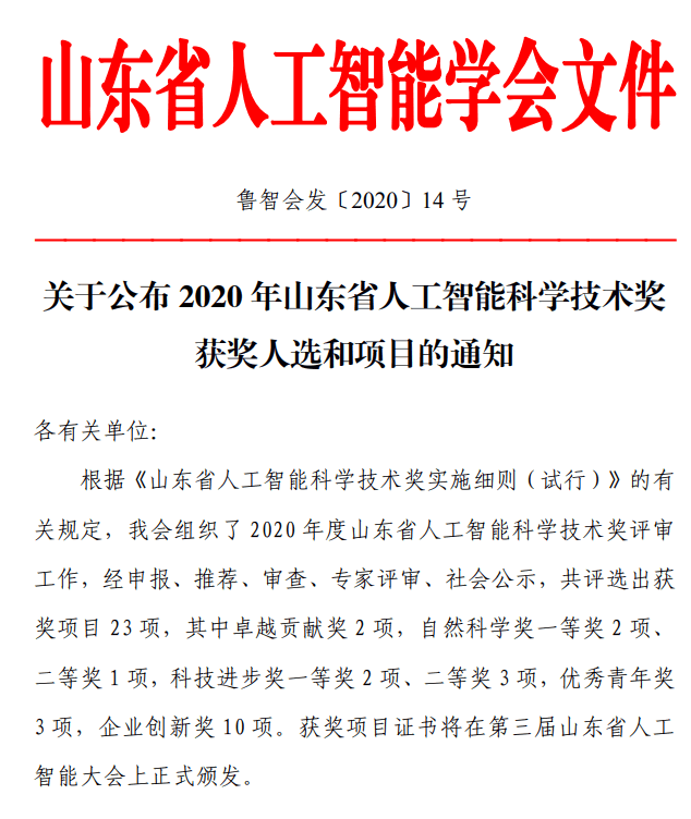 根據《山東省人工智能科學技術獎實施細則(試行)》的有關規定,我會組織了2020年度山東省人工智能科學技術獎評審工作,經申報、推薦、審查、專家評審、社會公示,共評選出獲獎項目23項,其中出色貢獻獎2項,自然科學獎一等獎2項、二等獎1項,科技進步獎一等獎2項、二等獎3項,優秀青年獎3項,企業創新獎10項。獲獎項目證書將在第三屆山東省人工智能大會上正式頒發。