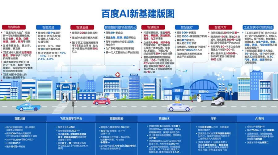 6月11日,百度發布AI新基建版圖,目標成為中國新基建AI服務大提供商。依托百度大腦、飛槳深度學習平臺、百度智能云、芯片、量脈、超級鏈等在內的新型AI基礎設施,百度在智慧城市、智能交通、智慧金融、智能客服與營銷、智慧能源、智慧醫療、智能汽車、工業互聯網和智能制造等八大L域推動產業智能化升級。