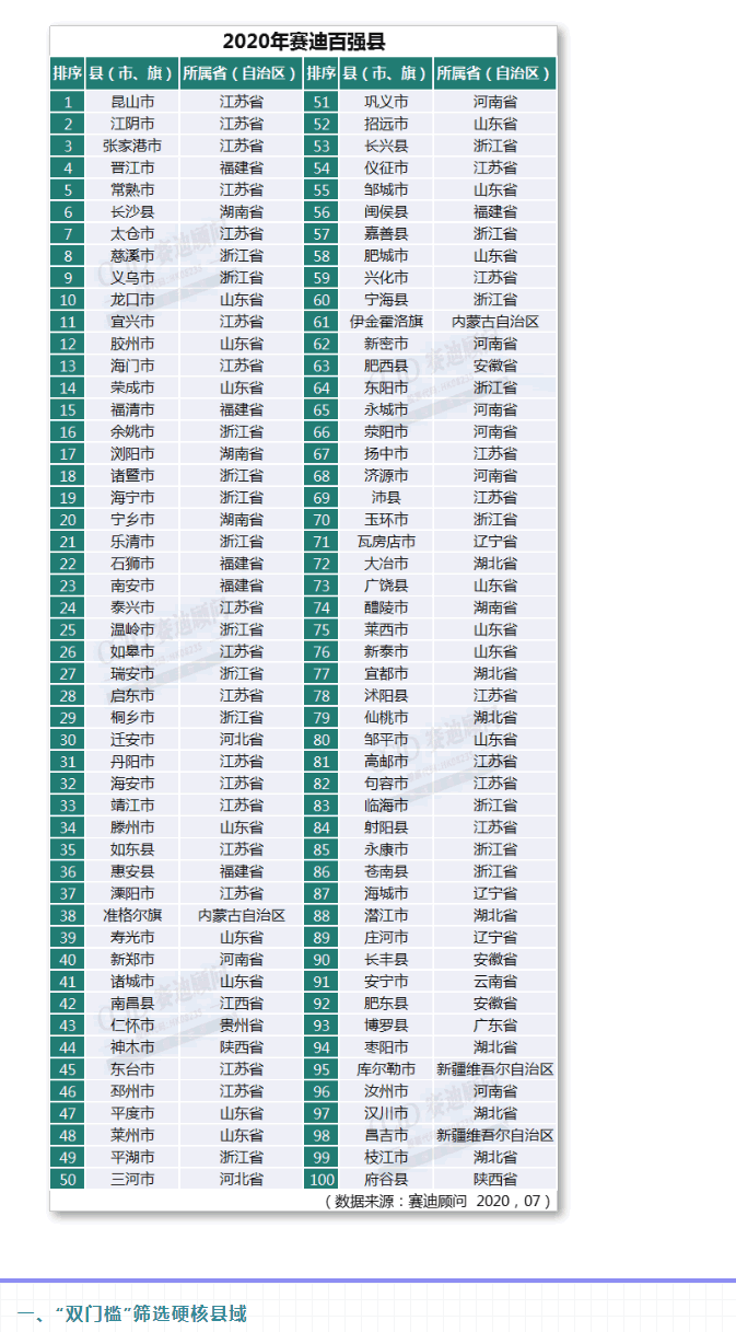 2020年7月28日,由賽迪顧問縣域經濟研究中心編制的《2020中國縣域經濟百強研究》正式發布。該研究聚焦新時代縣域G質量發展的新動力、新機制,多面解讀了縣域百強的區域格局和發展特征。