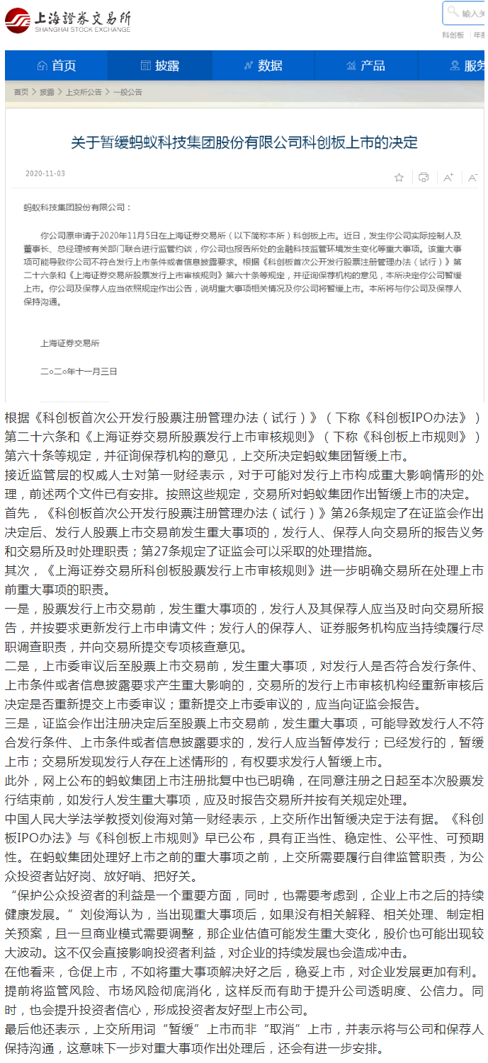 11月3日,上海證券交易所(下稱“上交所”)發布了《關于暫緩螞蟻科技集團股份有限公司科創板上市的決定》。