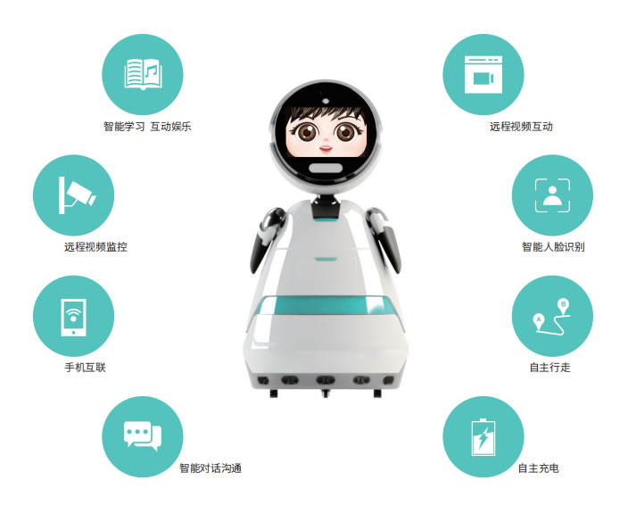 智能陪伴機器人采用機器人視覺系統、深度語音交互系統、先進的語音引擎,搭載環形麥克風陣列,運用聲控識別、語義理解、人臉識別、情緒識別等關鍵技術,在感知傳感器進行穩定準確地行走、語音合成、理解與識別。機器人采用云平臺加本地化語音庫支持各種信息顯示,表情展示、觸摸輸入等人工交互過程。上位機采用 Linux 與 Android 操作系統通過串口方式與下位機通信,控制部分通過 Can 通信方式連接各種傳感器采集外部信息。整個軟件系統包括機器人端、服務器端、手機端,通過網絡通信方式完成機器人互聯。產品具備娛樂、早教、陪護、安防等功能,可用于家庭陪護教育及遠程監控防護。