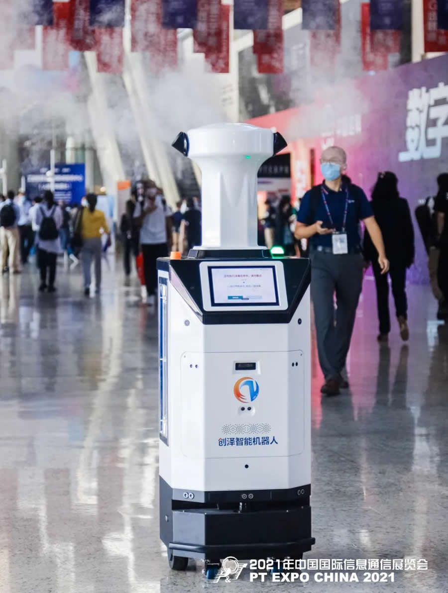 本屆PT展包含展覽、論壇、活動三個板塊,旨在為全行業搭建展示、交流、合作、共享的綜合性平臺,充分展示信息通信L域新興技術和應用創新成果,分享優秀經驗和成功案例,促進信息通信L域交流與合作。創澤集團受邀攜旗下智能黨建機器人、智能消毒機器人亮相本次展會,在現場擔任不同的“角色”提供全場景智能化服務。