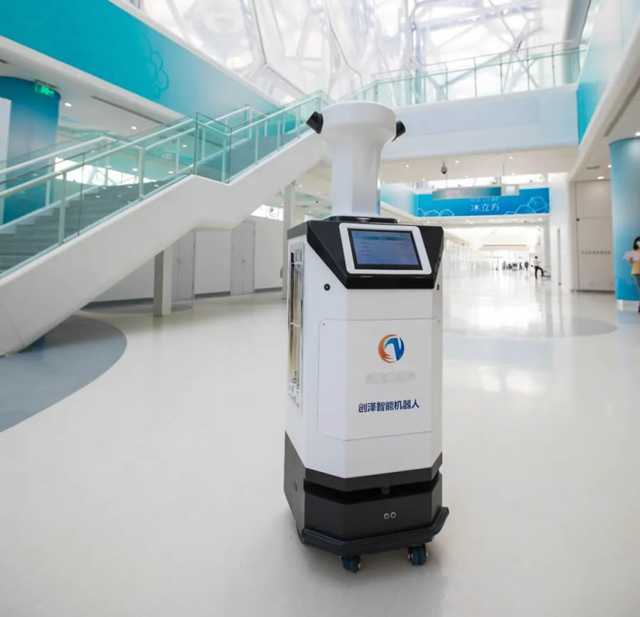 “冰立方”將成為冬奧會歷史上體量大的冰壺場館、世界水上項目和冰上項目均可運行的雙奧場館,提供智能化、G水準、全方位的賽事服務館,也是世界上在泳池上架設冰壺賽道的奧運場館。創澤智能消毒機器人可對場館內的觀眾區、媒體工作區、運動員區、比賽大廳等8600平方米的室內大面積公共區域開展消毒保障,解決了疫情防控下場館分區防疫消殺的難點問題,確保測試賽有序推進。