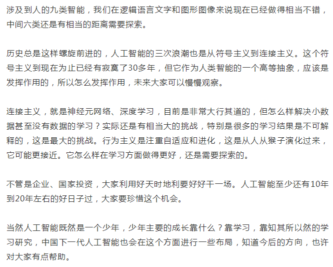 第三個是跨媒體智能,要把聲音、圖像、文字、自然語言所有這些東西聯結在一起來研究智能,這是跨媒體智能未來所希望達到的目標。