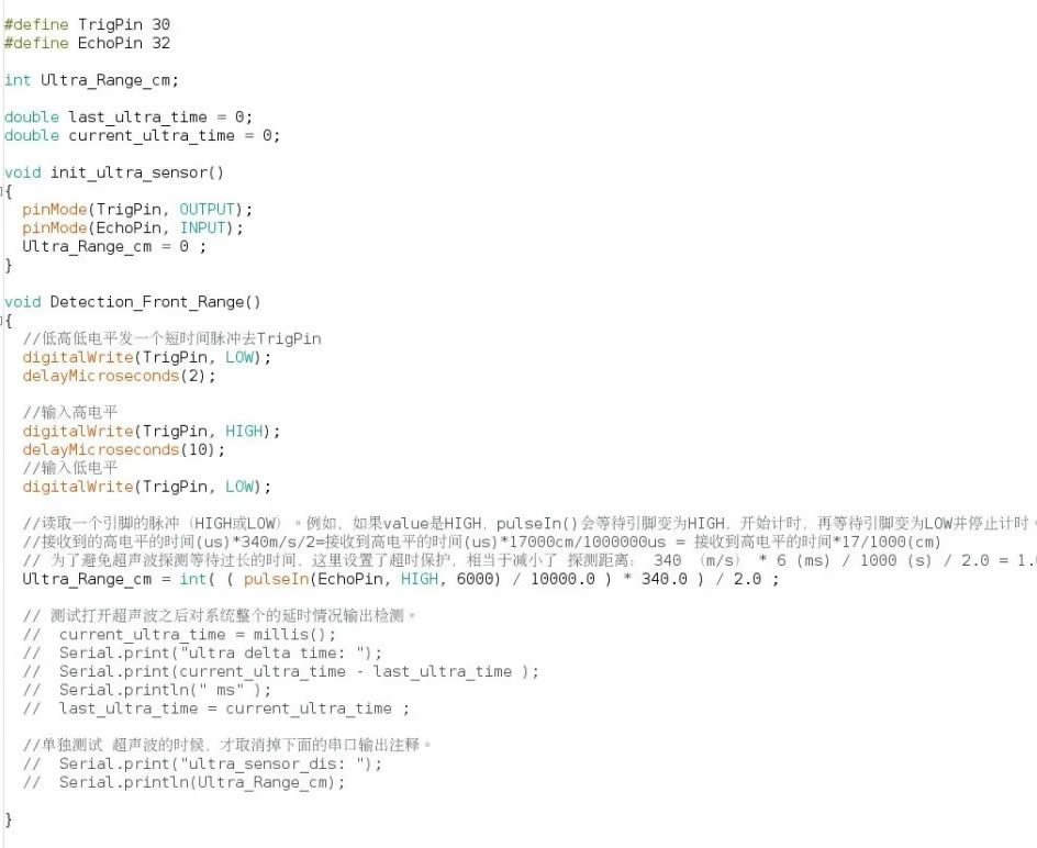 該程序定義了一個存儲測距信息的變量 Ultra_Range_cm , 測距范圍為“0-1m”。此時,我們可以看見下面有兩大段注釋。其中,D一段是用來測試整個系統功能執行一遍所需要的時間,若取消掉注釋,即可在 串口監視器 實時查看輸出的時間信息。