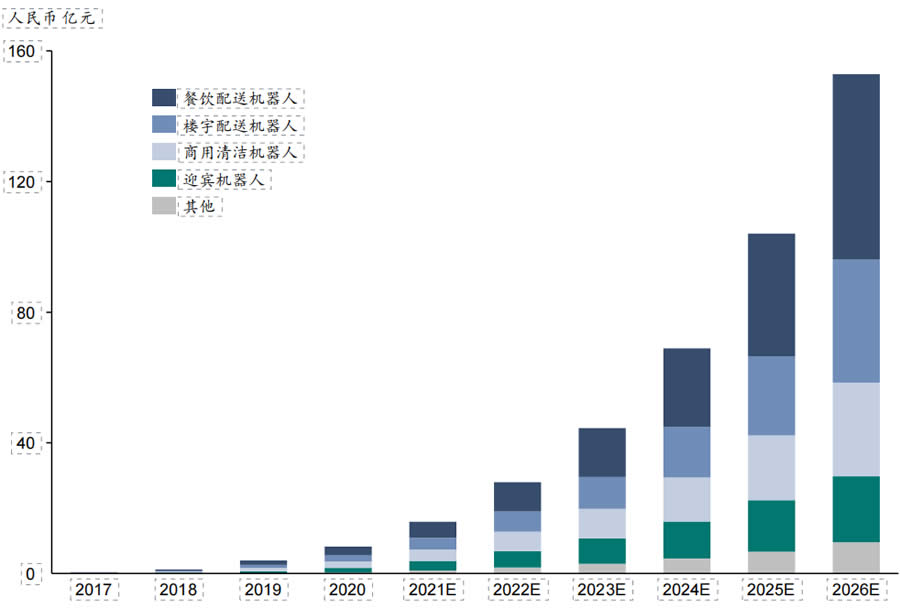 推進,中國商用服務機器人行業將迎來快速增長,預計2026年市場將超過150億元人民幣,其中餐飲配送機器人、商用清潔機器人、樓宇配送機器人為前三大