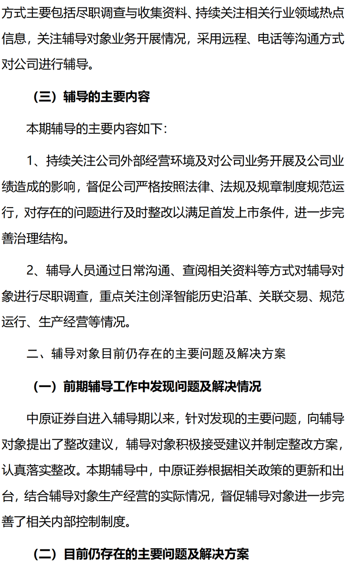 中原證券關于創澤機器人上市輔導內容,對公司業務開展及公司業績造成的影響,督促公司嚴格按照法律,法規及規章制度規范運行,關注創澤智能歷史沿革生產經營等情況