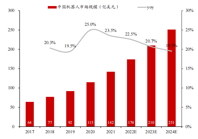 根據IFR、中國電子學會數據,預計機器人市場規模2024年有望達到660億美元,2020-2024年CAGR約18%。