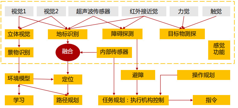 視覺感知控制基于2D,3D攝像頭信息采集實現目標感知;多模態融合控制進行感知模態信息融合進行運動預測與意圖識別